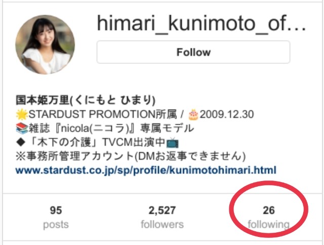 たとえば、いま国本姫万里ちゃんがフォローしているのは、26コのアカウントとなっています。