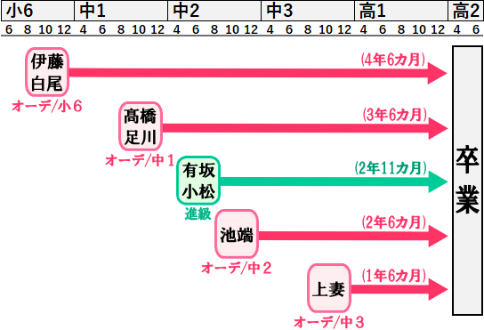 この点、沙音ちゃんたち小6で合格すると、卒業まで時間はたっぷり。なんと4年半もあることが分かります。