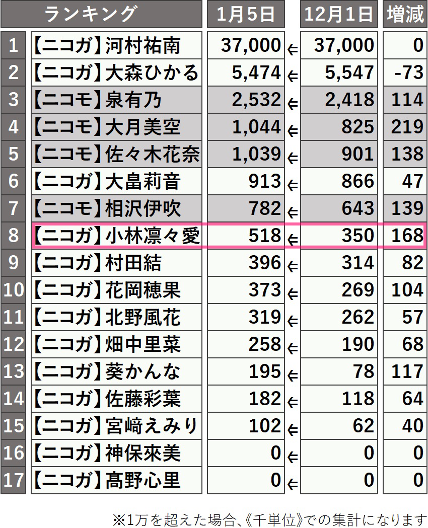 そんな注目のニコガたちのフォロワー数を、とくに小林凛々愛ちゃんに着目しつつ、同期のニコモとともに一覧にまとめます。