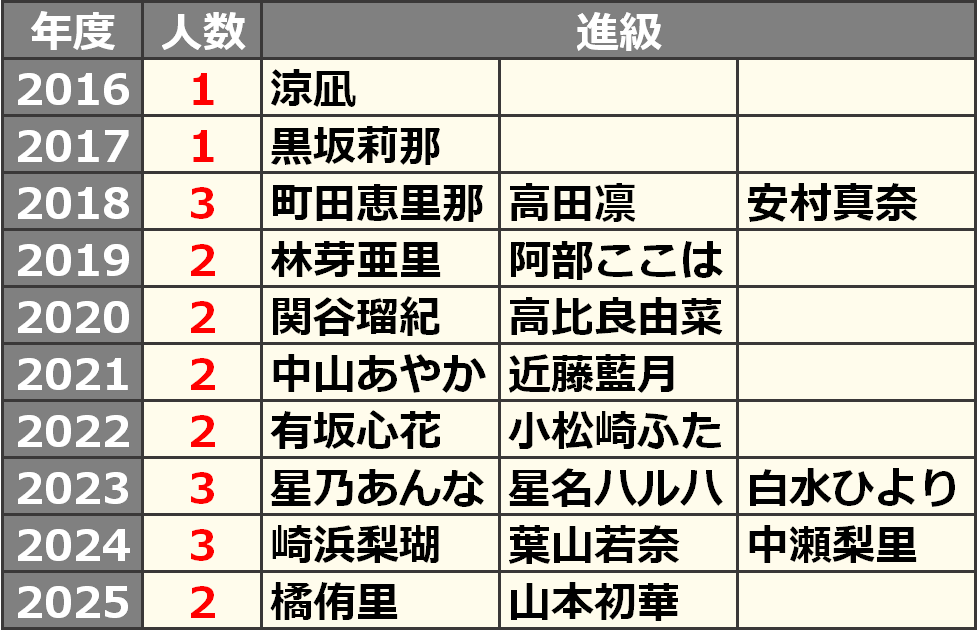 なお、2015年以前はというと、初代進級の伊藤夏帆さんから、2015年進級の香音さんまで、2014年の進級ゼロを除き、いずれも1人となっています。